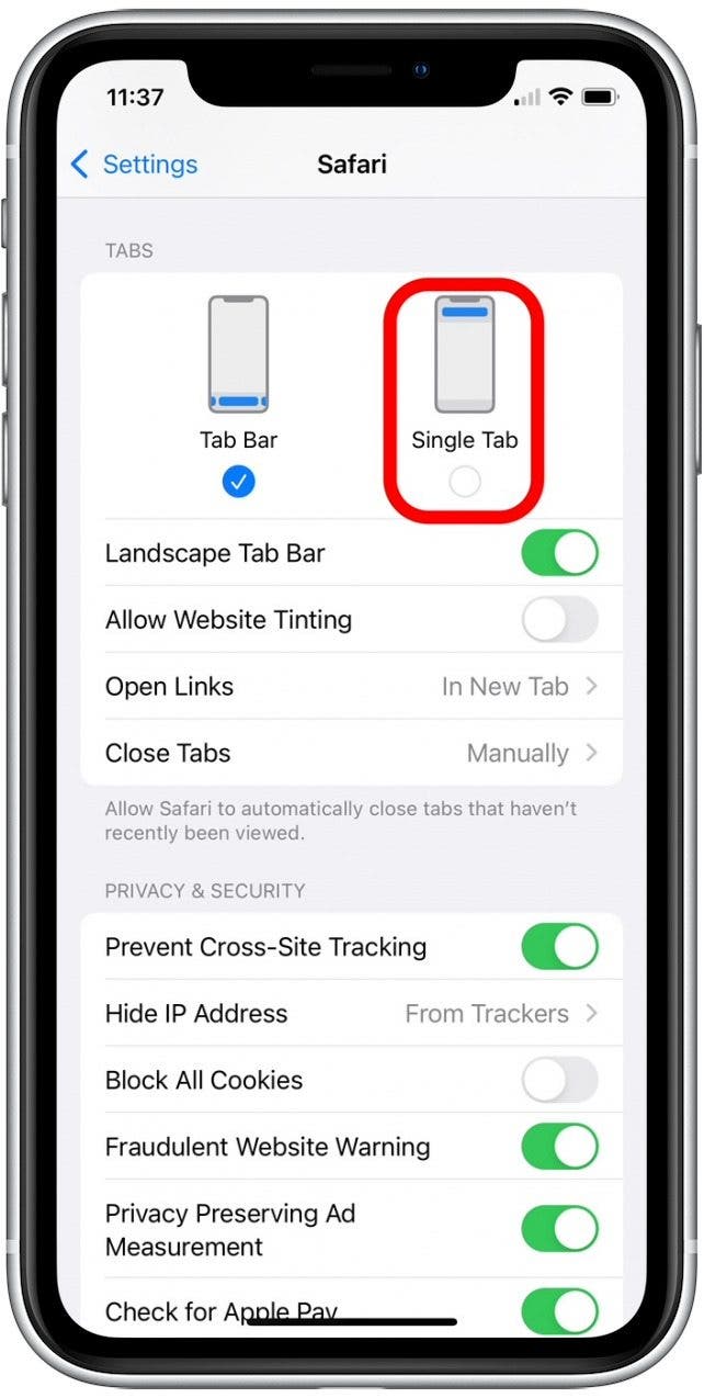 将搜索栏移至屏幕底部是 iOS 15 中 Safari 最大的变化之一。幸运的是,如果您不喜欢此更改,可以将其切换回来! Safari 现在有两种选项卡模式:单选项卡和选项卡栏。在单选项卡模式下,您的 Apple 地址栏显示在 Safari 顶部,您必须点击选项卡图标才能在选项卡之间切换。在选项卡栏模式下,您的 URL 地址栏显示在底部,您可以在打开的 Safari 选项卡之间滑动。下面,我们将介绍如何在 Safari 中将 URL 栏返回到页面顶部。