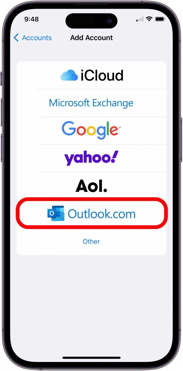 - 如果您不想下载单独的应用程序,您还可以在“设置”应用程序中添加您的 Outlook 帐户以同步您的日历、邮件、联系人等。