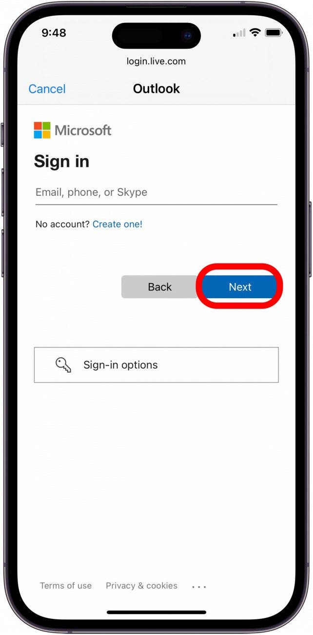 - 输入您的 Outlook 电子邮件地址并点击下一个。
