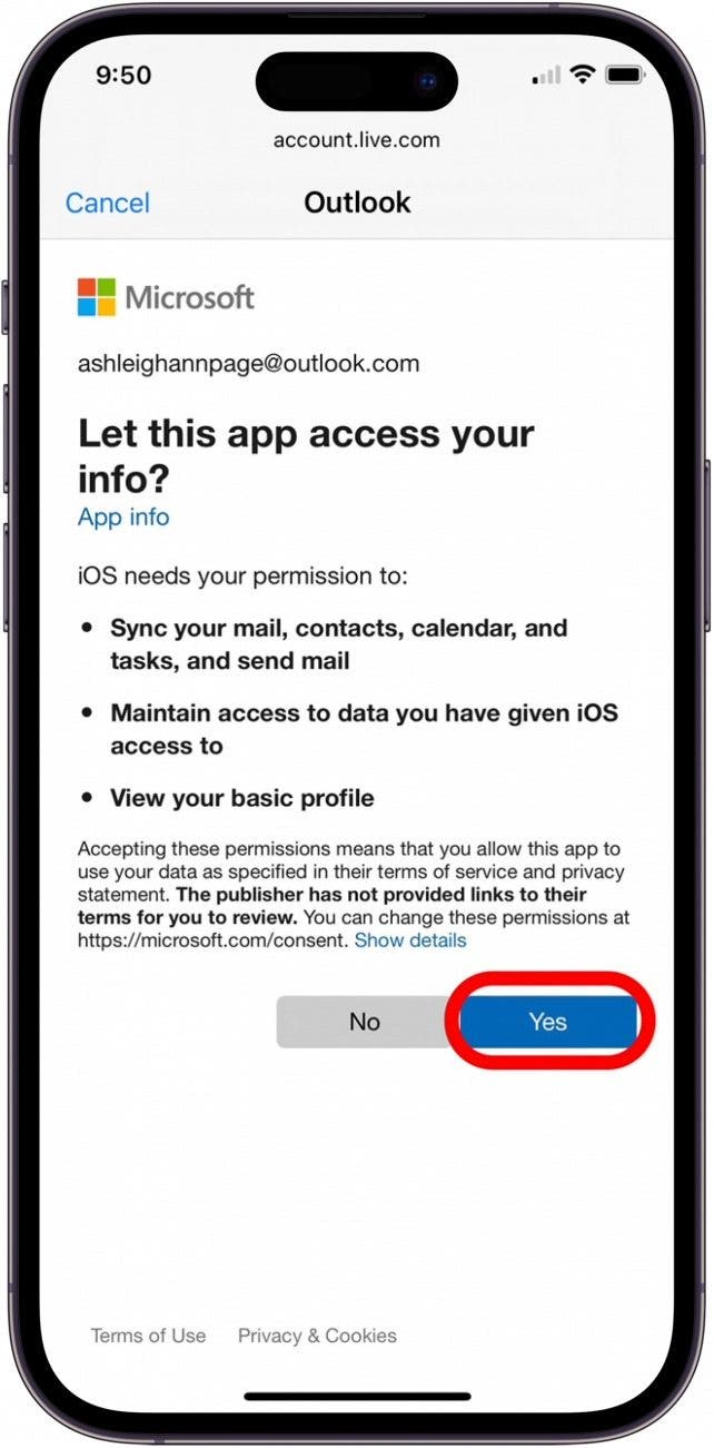 - 轻敲是的允许您的 iPhone 访问您的 Outlook 电子邮件、联系人、日历和便笺。