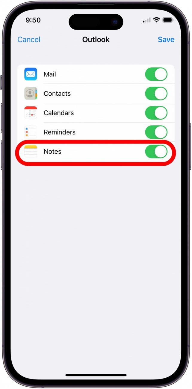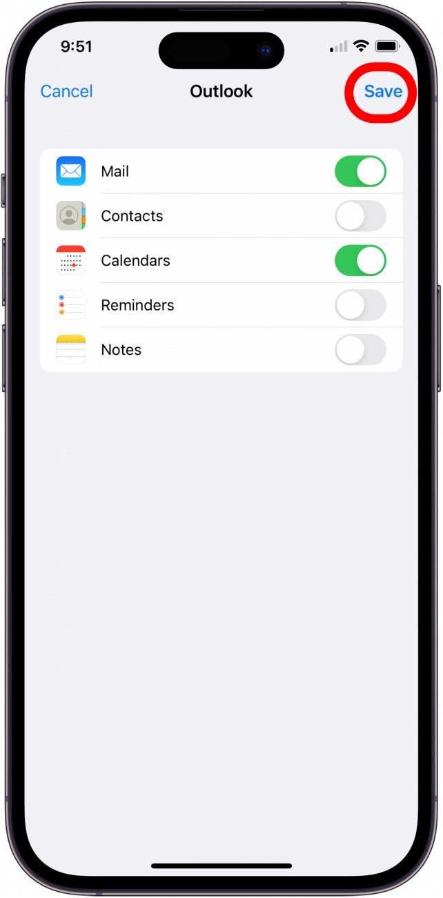 - 默认情况下,您的所有 Outlook 帐户信息都会与您的 iPhone 同步。如果您不想同步 Outlook 数据,请点击切换开关以取消选择它。
