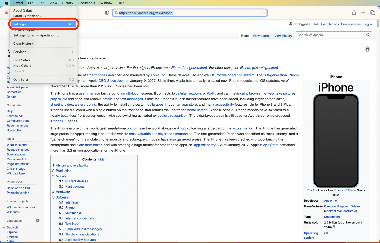 - 在 Mac 上,跨设备共享的设置和单个网站设置都可以在 Safari 的同一菜单中找到。因此,打开浏览器并导航到您想要调整设置的网站(在我的示例中,我使用维基百科)后,然后单击野生动物园菜单。