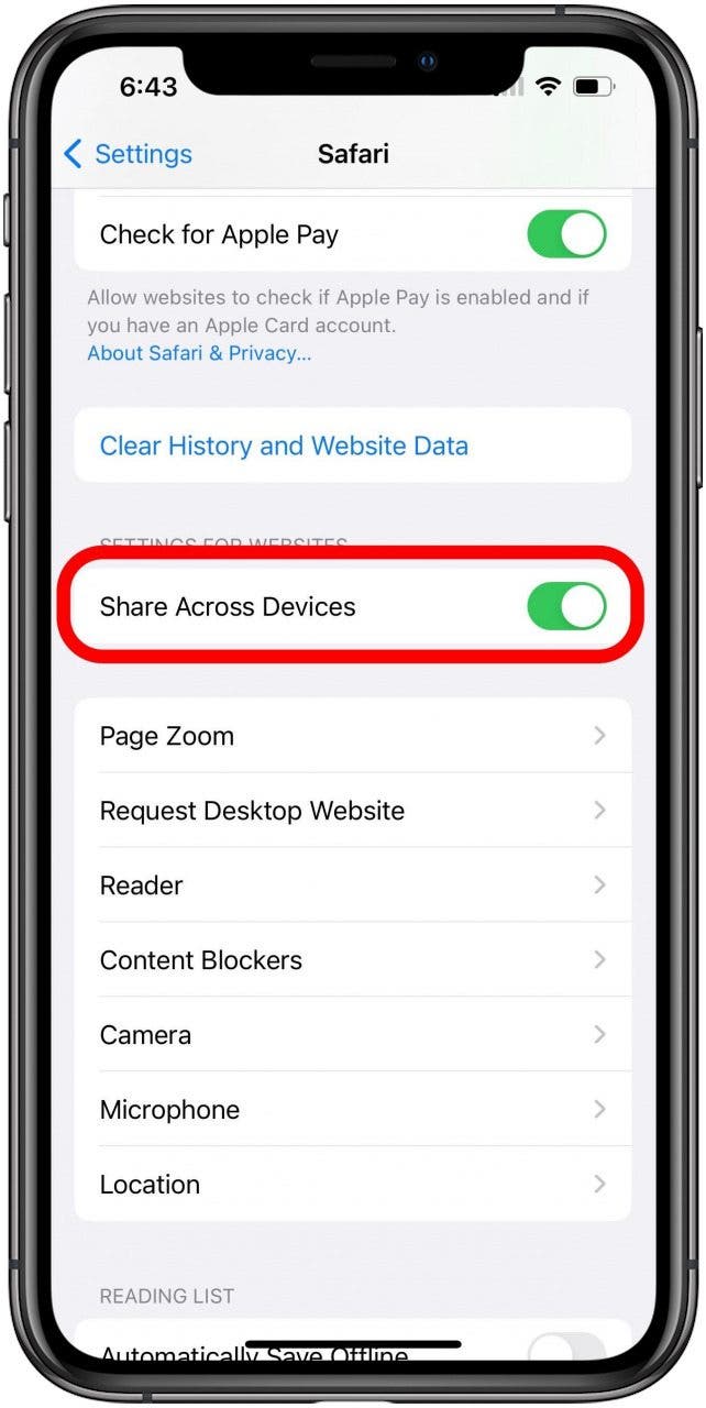 - 设置窗口可能会在网站选项卡,但如果没有,请单击它。在左下角,有一个标记为的复选框跨设备共享。如果您希望将网站设置同步到您的 iPhone 和其他设备,请确保选中此项;如果您不希望,则请取消选中此项。该窗口中还包含所有网站设置。左侧栏中有各种类别,例如页面缩放、阅读器和下载。单击其中任意一个即可查看可以在窗口右侧部分调整的设置。