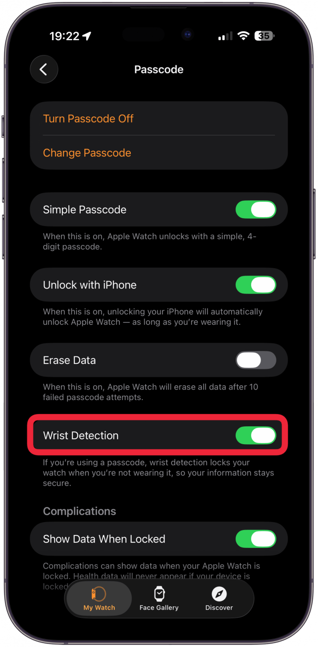 - 您可能需要考虑启用手腕检测,这样,如果您的 Apple Watch 检测到您跌倒,但您在 30 秒内没有移动,它会自动呼叫紧急服务。要打开手腕检测,请点击密码 在 iPhone 上的 Watch 应用中。