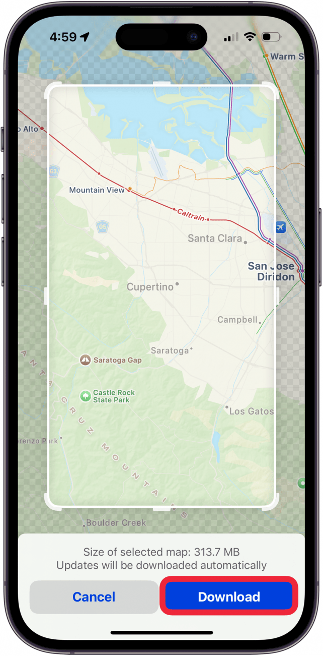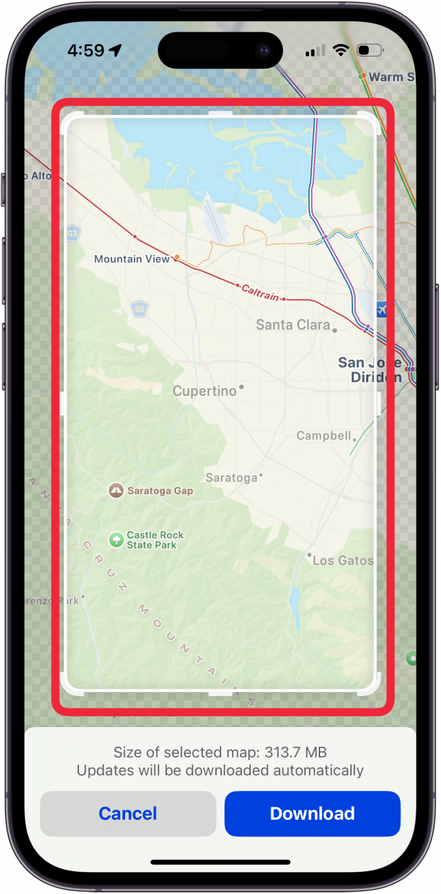 - 您可以拖动地图的角点来调整可下载区域的大小,以节省空间或捕获更大的地图区域。
