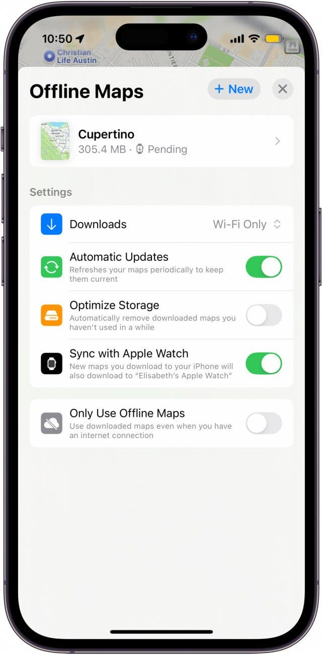 - 您将看到下载的 Apple 地图,并能够调整各种设置,包括允许在 Wi-Fi 或蜂窝网络上下载、启用或禁用自动更新、优化 iPhone 存储、同步到 Apple Watch 或仅使用离线地图。