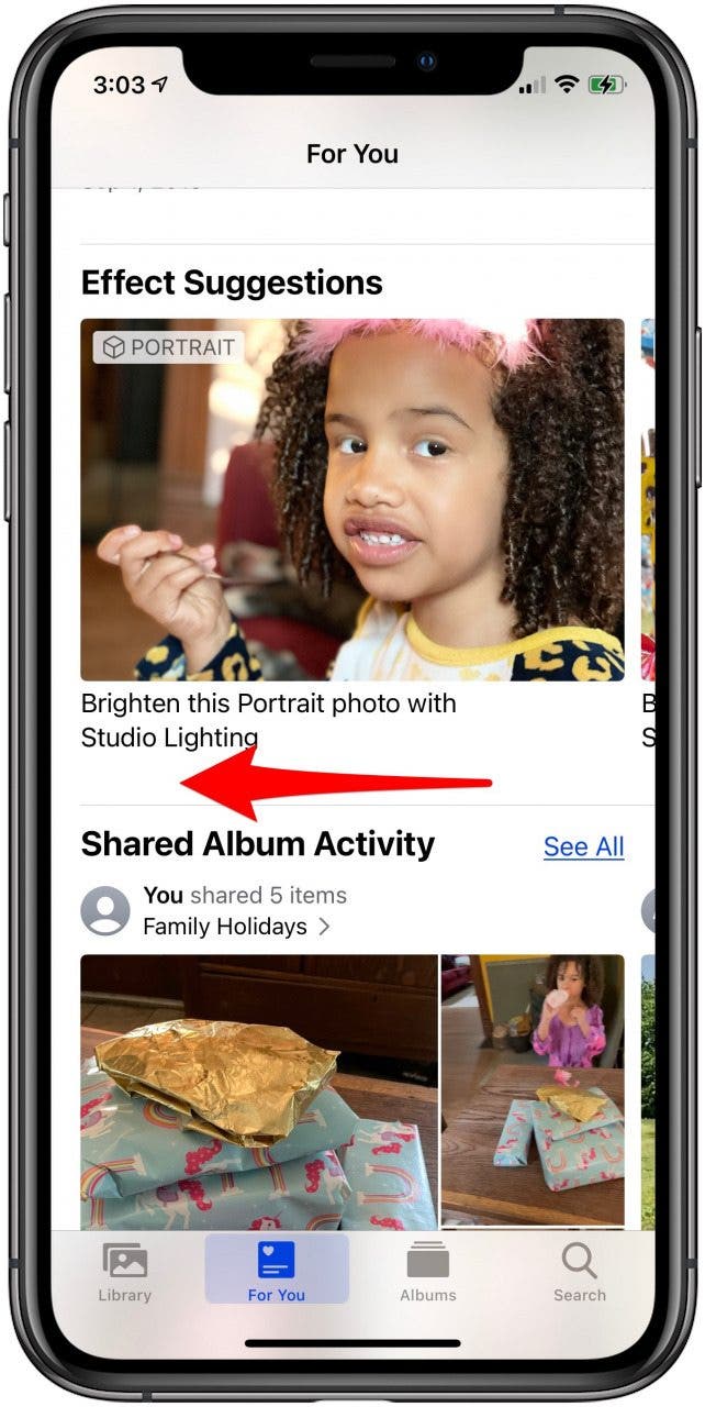 如果您的“照片”应用程序已打开并且您位于“为您推荐”选项卡上,但您浏览过该应用程序后却找不到“效果建议”,请检查您的 iPhone 软件是否已启用。