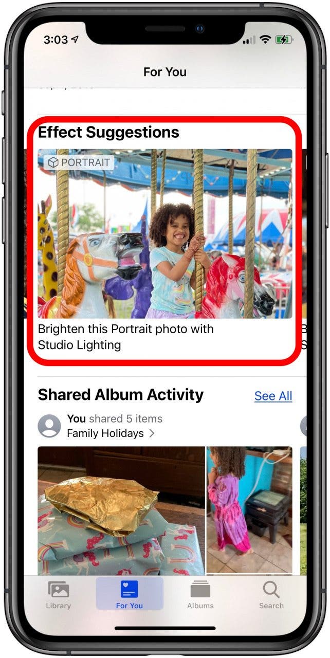 效果建议是照片应用添加到“为您推荐”选项卡中精选照片的滤镜和效果。一些效果包括循环或工作室照明。这些建议基本上是根据您的照片以及照片应用程序认为它们可以如何改进而为您挑选的。以下是如何在 iPhone 的照片应用中使用效果建议: