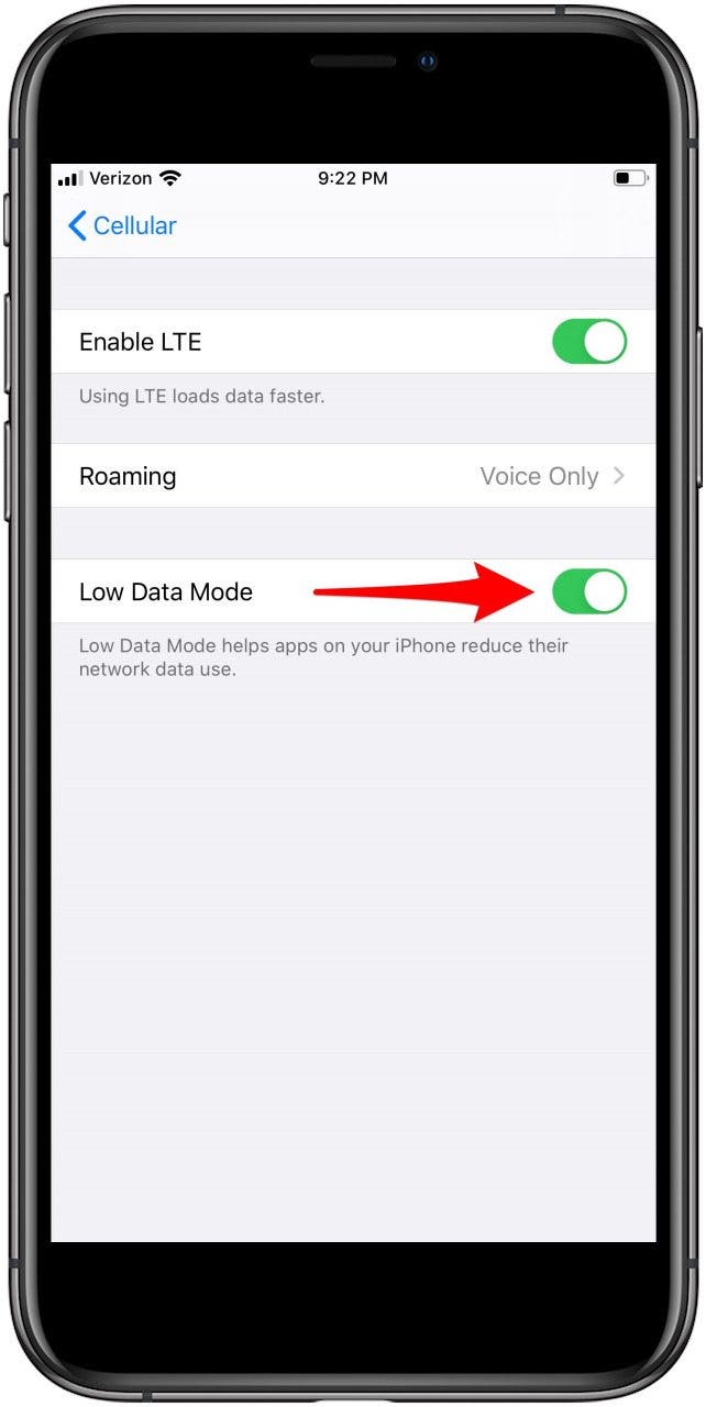 如果您使用的是双 SIM 卡设备,则可以为您使用的每个蜂窝网络套餐打开低数据模式。为此: