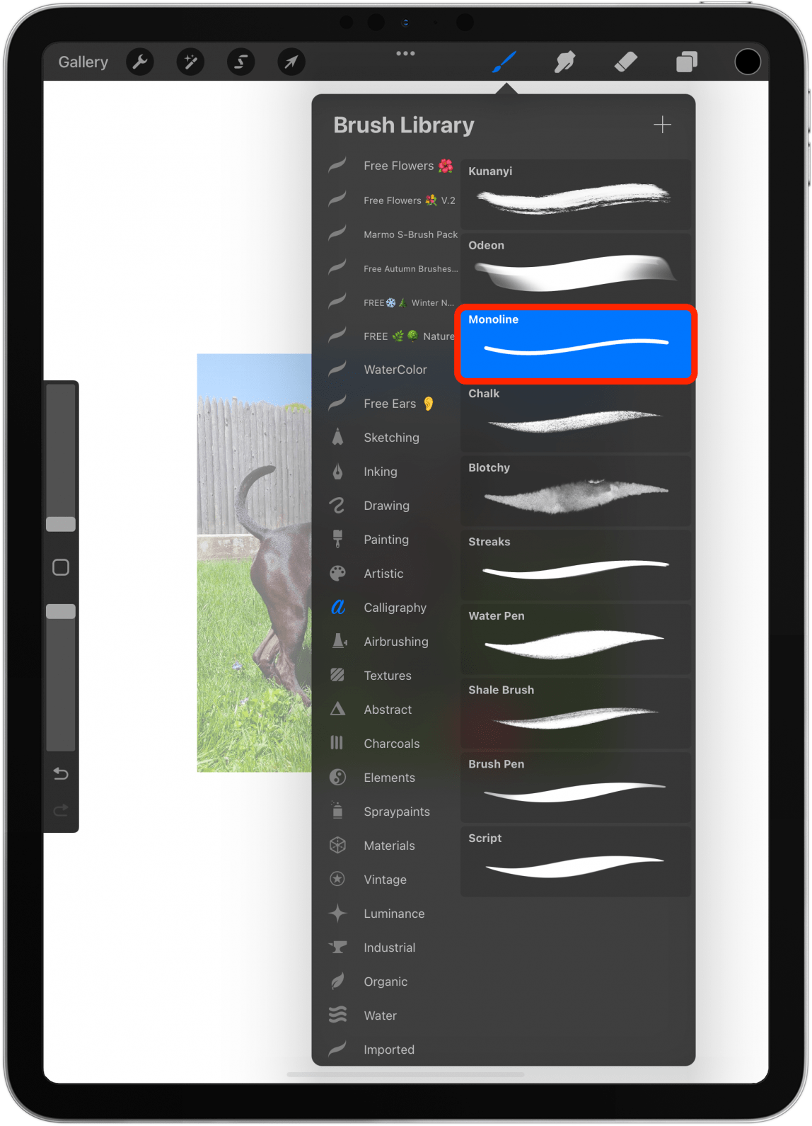 - 在这里您将看到多种默认画笔可供选择。我有很多您不会在画笔库中看到它。有些刷子比其他刷子更容易使用。最简单的偶数线可以在书法。