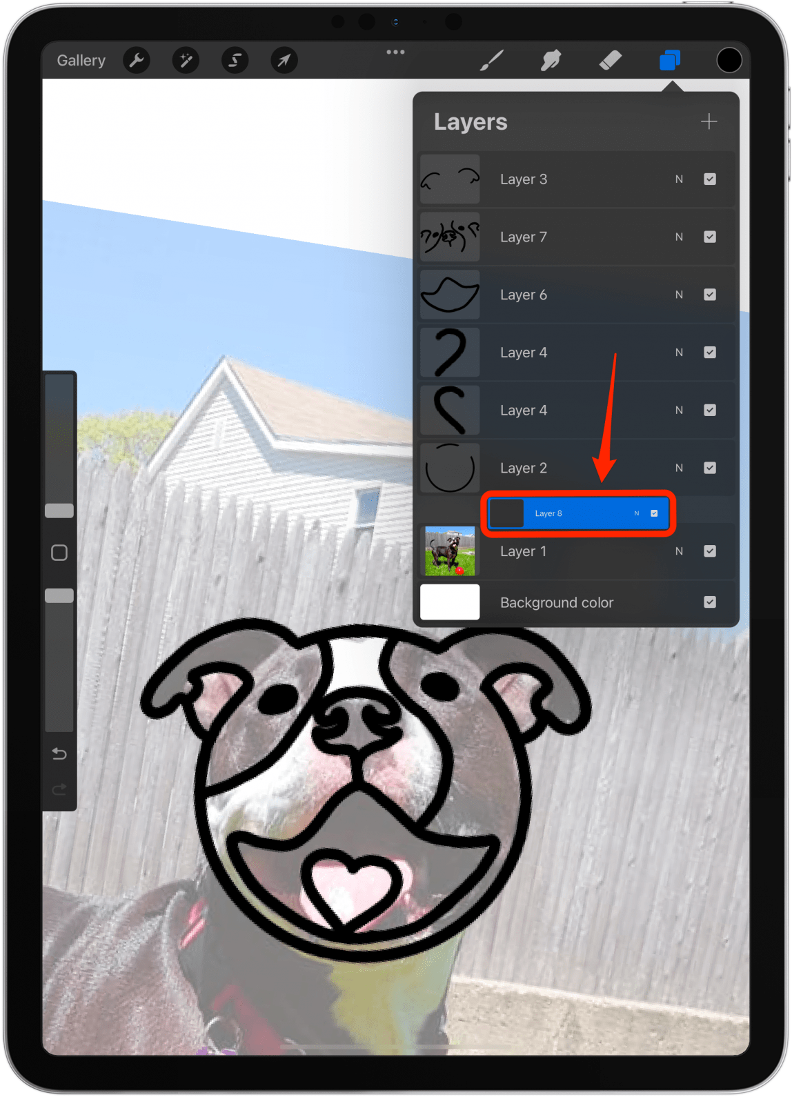 - 接下来,我们将进行一些着色!我喜欢为每种颜色创建一个新图层。确保将图层拖动到照片图层上方的最底部,这样它就不会覆盖线条。