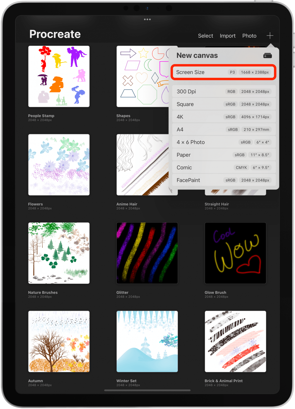 - 轻敲屏幕尺寸。我在下面链接的 Procreate 文章中介绍了 Canvas 尺寸调整。