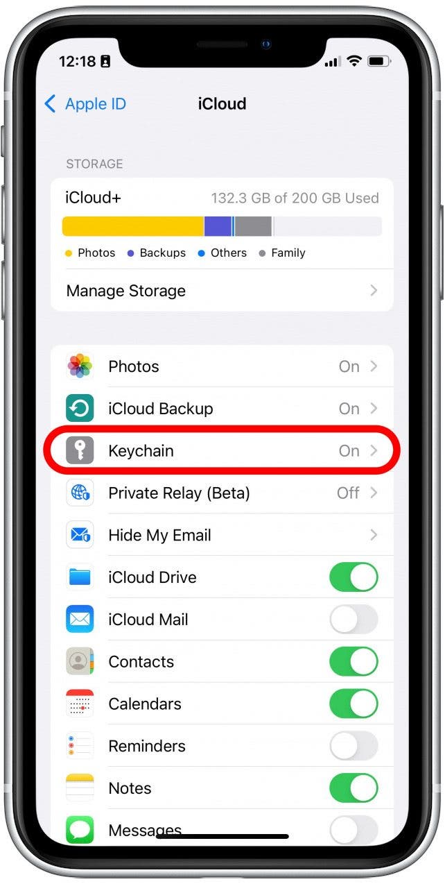 - 点击iCloud 钥匙串切换启用 iPhone 和其他设备之间的密码同步。启用后,切换开关将呈绿色。