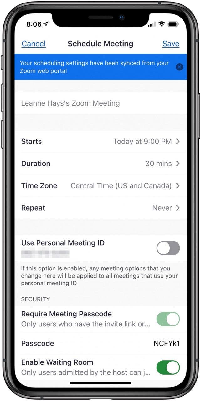 - 您可以在此处更改会议开始时间、持续时间、时区、是否重复、需要会议密码的选项、启用等候室、允许参与者先于主持人加入以及自动录制会议。