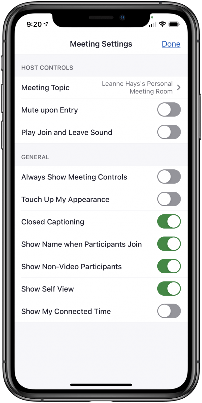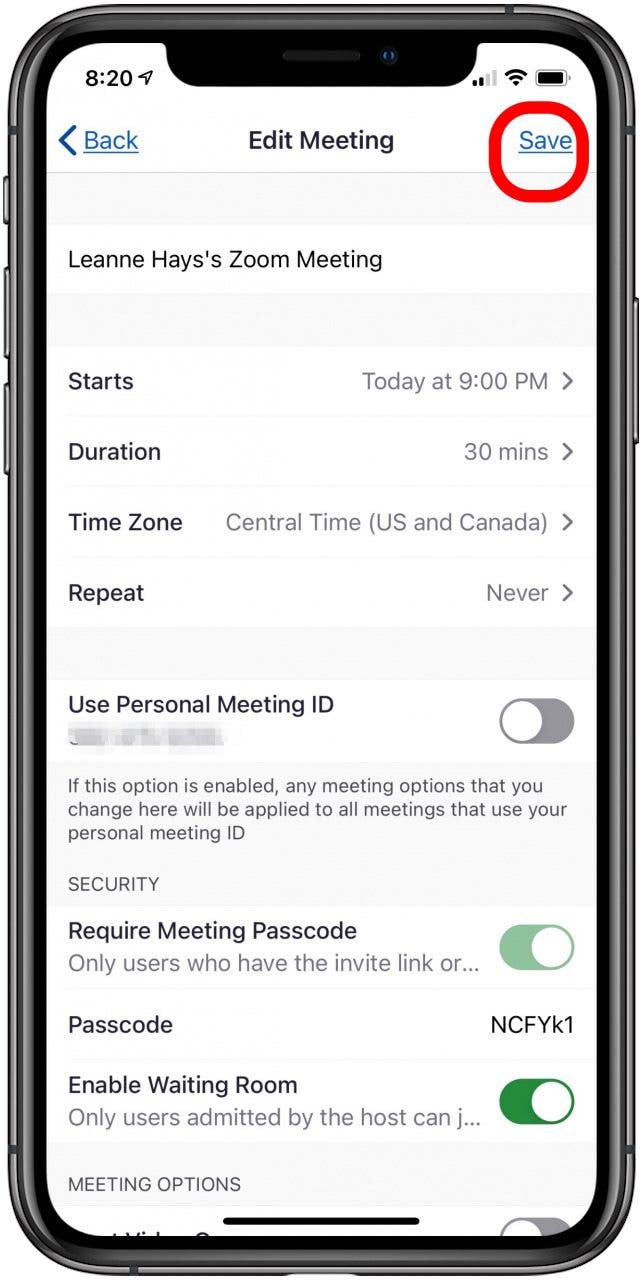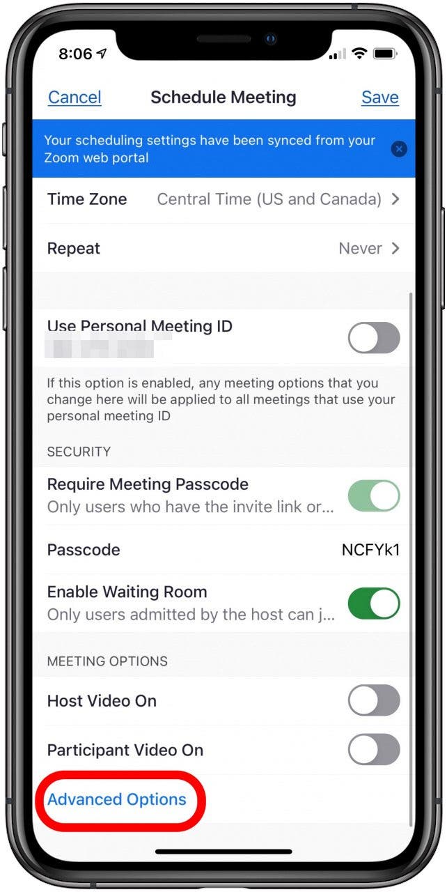 - 轻敲高级选项如果您希望允许会议成员在您之前加入,或自动录制您的会议。轻敲节省当完成时。