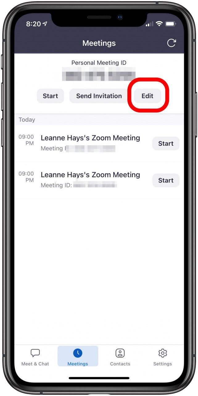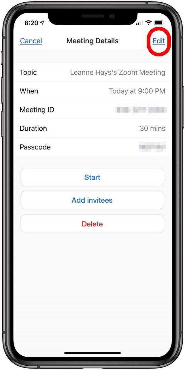 - 从这里,您可以提前开始会议、添加受邀者或删除会议。轻敲编辑再次更改更多设置。