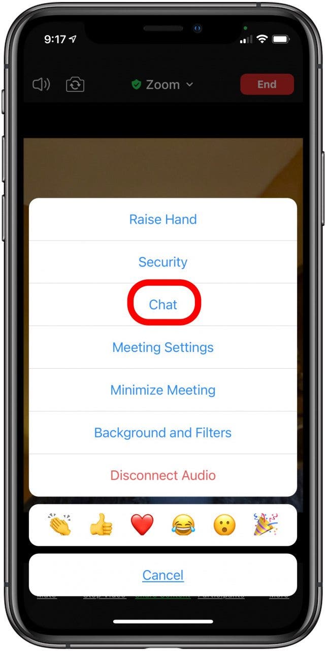 另一个有用且有趣的 Zoom 功能是聊天选项。要访问此功能: