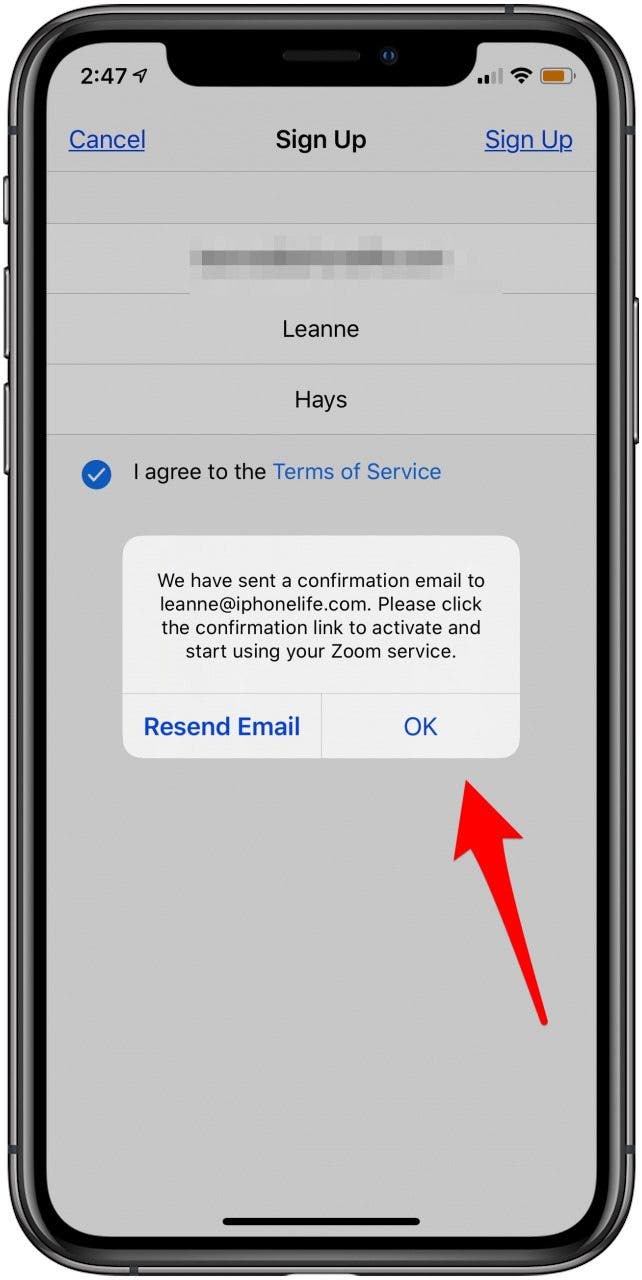 - 轻敲好的,然后转到与您输入的电子邮件地址关联的收件箱,并且单击链接激活您的 Zoom 服务。