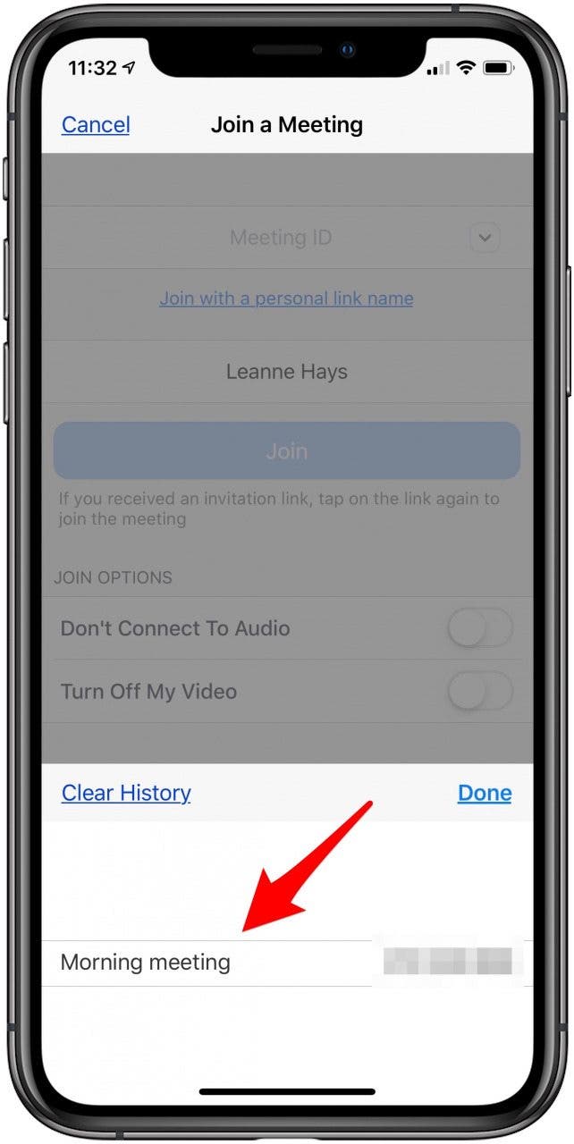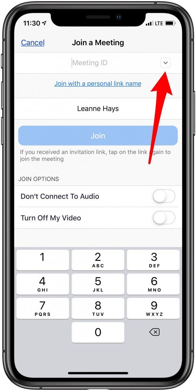 - 如果这是您之前加入过的会议,请点击小箭头以显示您之前加入的所有会议。