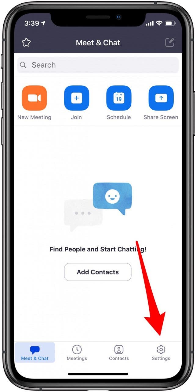 - 轻敲设置位于 Zoom 应用程序主屏幕的底部。