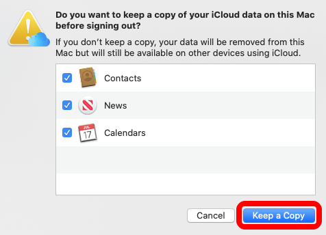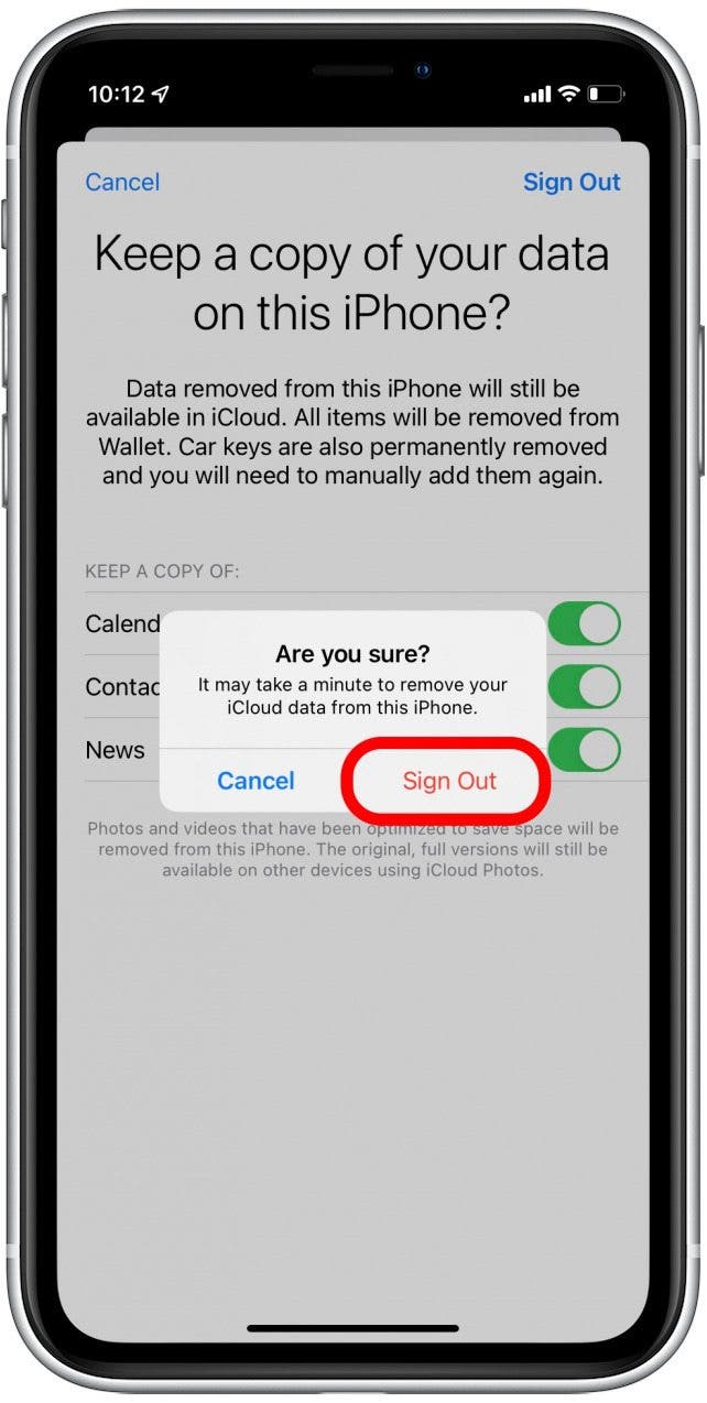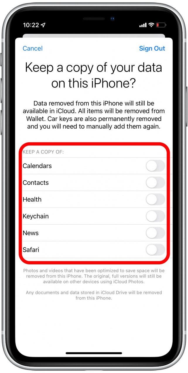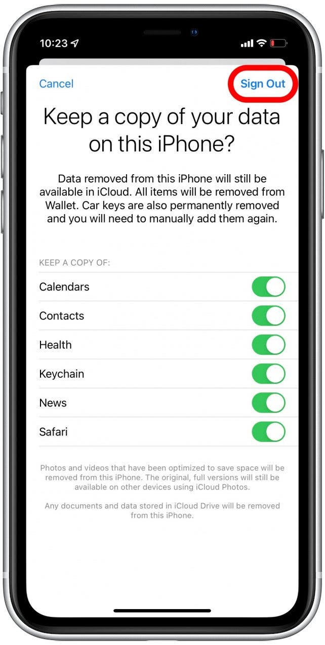 - 确定您是否想要在 iPhone 上保留数据的副本。当您重新登录后,这些数据将立即可用,但如果您担心,您可能需要在退出 iCloud 之前。