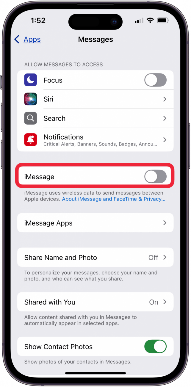 如果 iMessage 或 FaceTime 无法工作,关闭然后再打开通常可以解决问题。就像关闭然后打开 iPhone 可以解决很多问题一样,关闭然后打开 iMessage 或 FaceTime 通常也会起到同样的作用。此外,为了发送 iMessage,需要启用 iMessage,有时它会以某种方式关闭。如果您收到“需要启用 iMessage 才能发送此消息”通知,则肯定发生了这种情况,因此您需要进入并打开 iMessage。