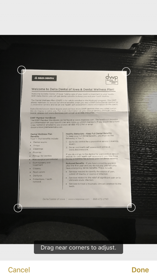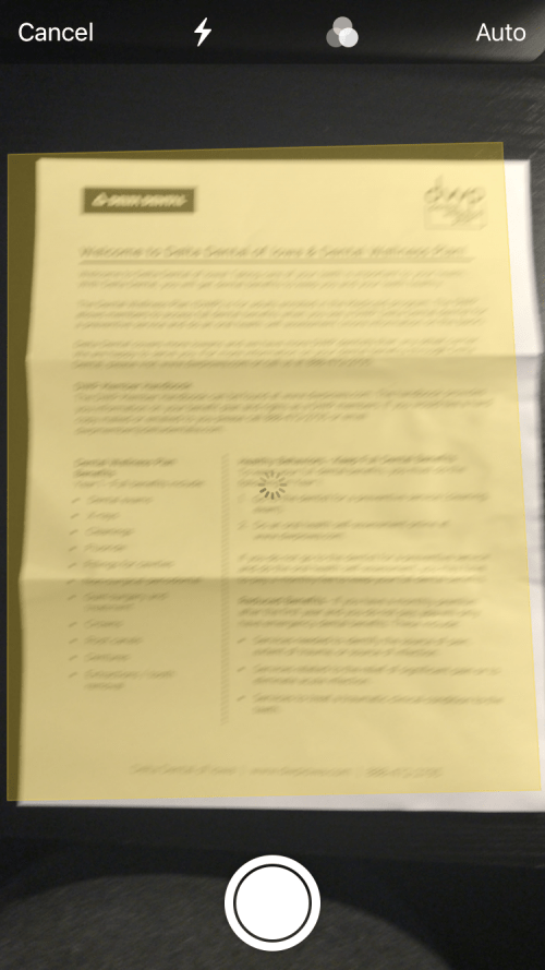 - 将文档捕获窗口置于页面中央以自动捕获文档。这个橙黄色的盒子还进行了一些幕后调整,以消除倾斜和眩光等变量。自动捕获最适合高对比度背景,例如黑色桌子上的白色页面。