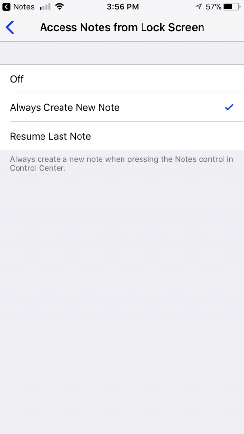 - 默认为“始终创建新笔记”,但您可能希望将其更改为“恢复上一个笔记”,或者当通过选择“关闭”锁定设备时根本不让它显示在控制中心上。