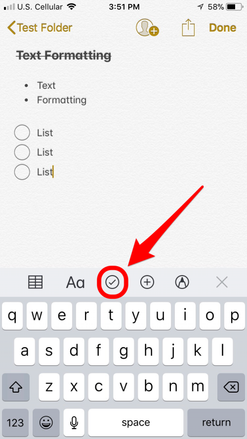 除了“Aa”中的三行菜单之外,我们还可以返回主菜单以获取额外的文本列表选项。选择带有圆圈的复选标记,创建一个您可以点击完成的项目清单——对于我个人几乎每天都会做的那种快速绘制列表来说,这是一个非常方便的功能。