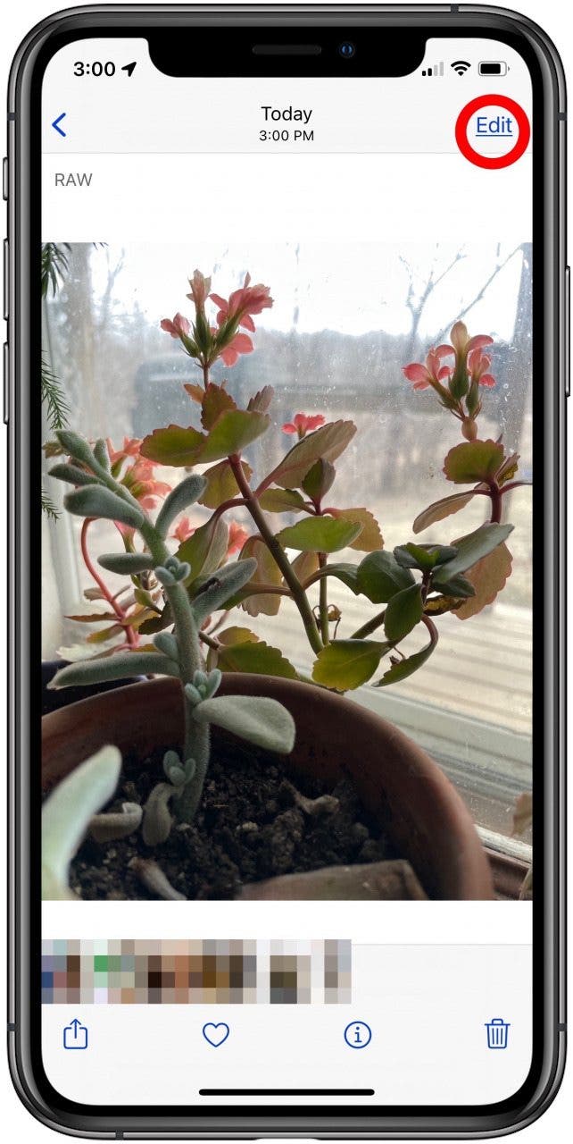 - 您会在屏幕左上角看到 RAW;轻敲编辑。