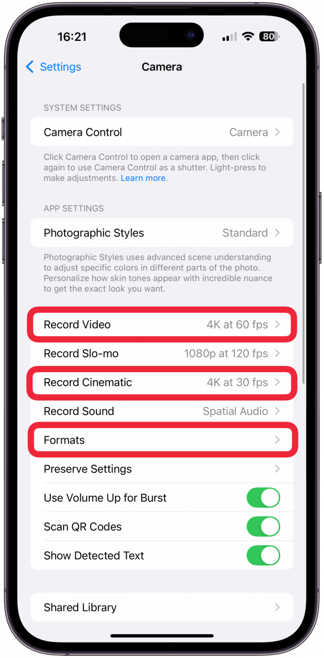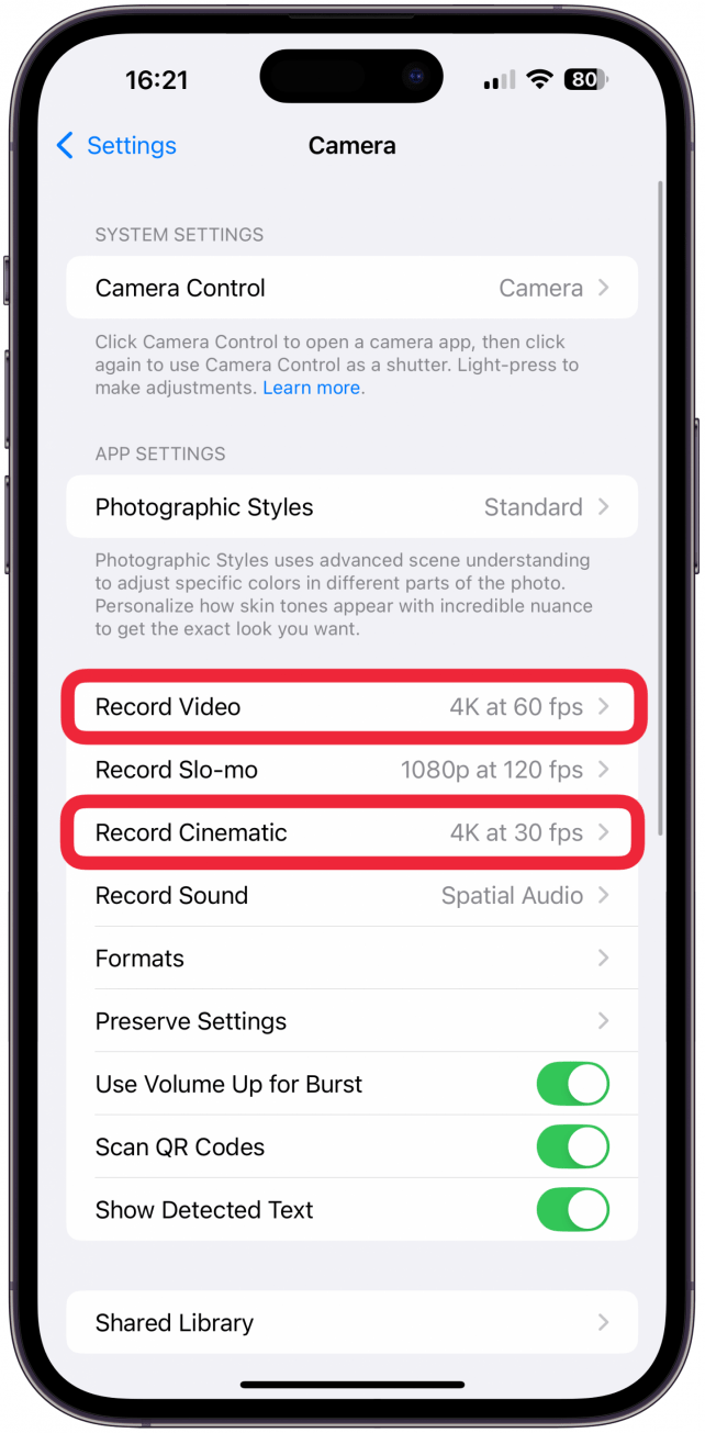 - 要获得最佳质量的视频,请务必点击录制视频和录制电影并在每个部分中选择最佳质量的选项。在 iPhone 16 Pro Max 和大多数较新的 iPhone 上,4K 是最佳质量,并且首选更高的 fps。