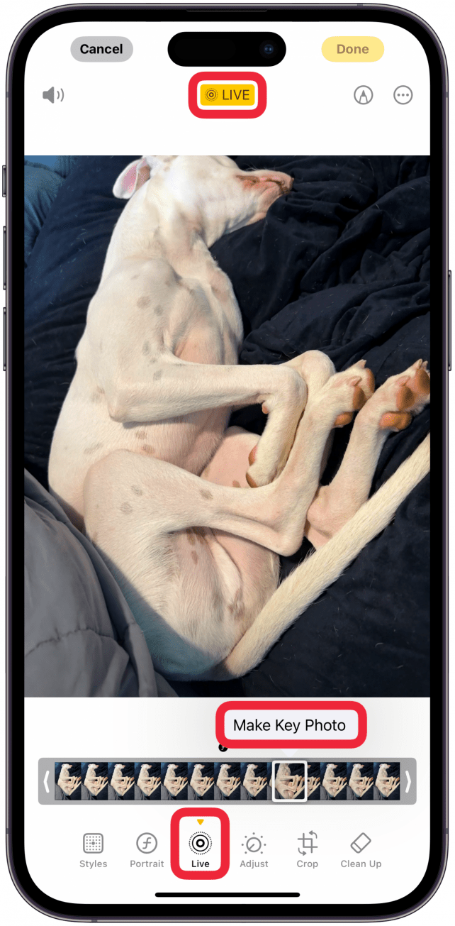 当您在照片应用程序中编辑实时照片并点击实时时,您可以看到 3 秒镜头中的所有静态照片,并且可以选择不同的关键照片。虽然您的 iPhone 通常擅长选择最佳的关键照片,但有时即使您的编辑设置中有更好的选项,它也可能看起来很模糊。