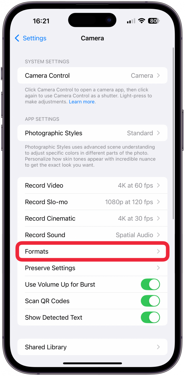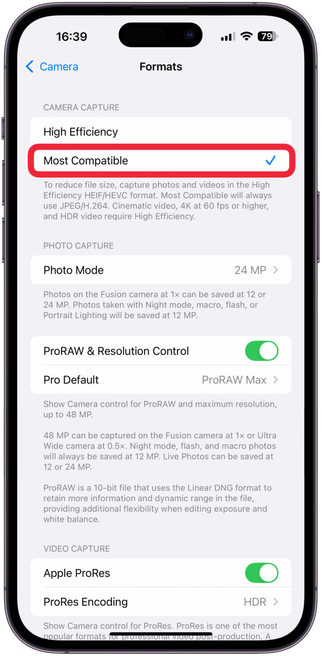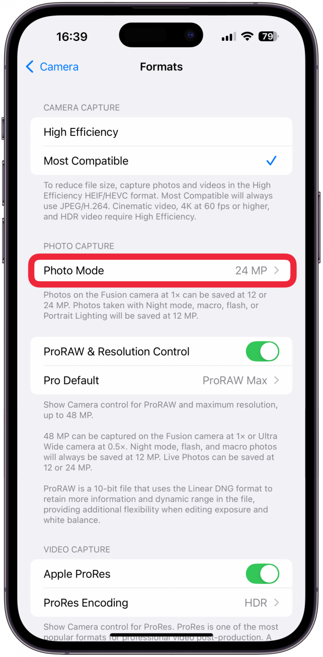 - 接下来,请确保您有24 MP被选为照片模式如果您有更新、更高端的型号,例如 iPhone 16 和 15 Pro 以及 Pro Max。
