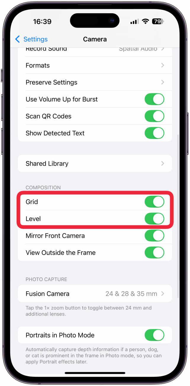- 返回相机设置并向下滚动至作品。在这里,确保切换 iPhone 相机网格和等级在;这将帮助您将手机稳定地固定到位,此外您还可以应用到你的摄影。