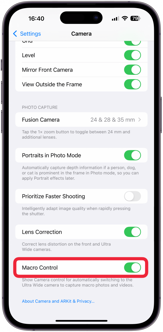 - 继续向下滚动并确保打开宏观调控。这使您有能力,这可以防止相机模糊甚至照片模糊。