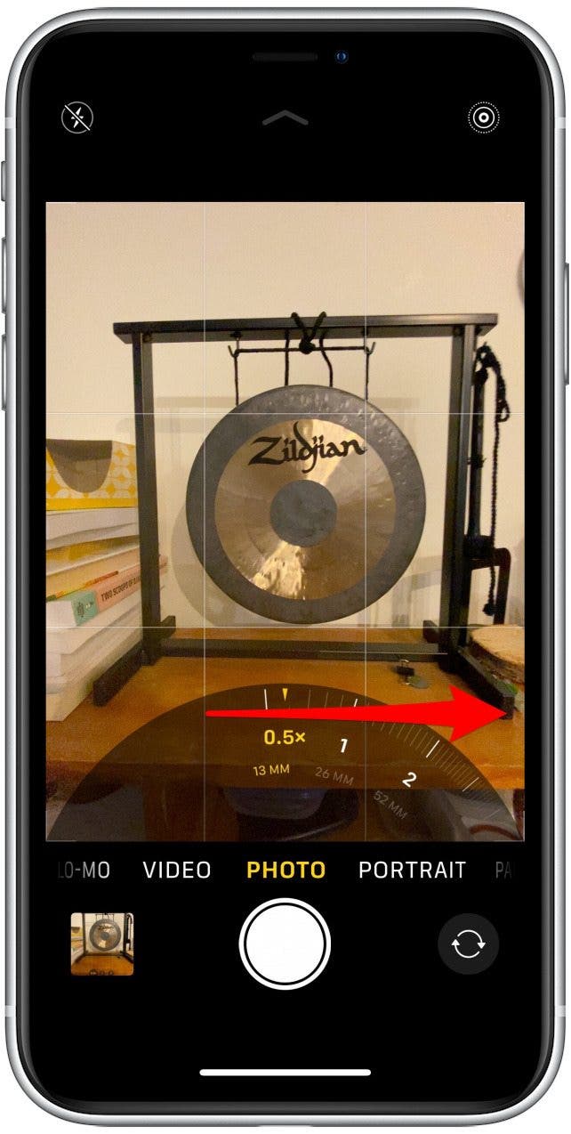 - 沿着转盘向右移动手指可放大或切换到超广角相机。
