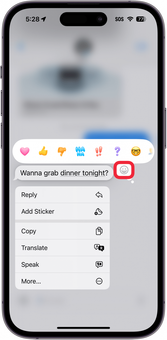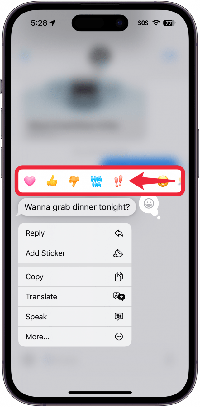 - 无论您使用表情符号还是贴纸做出反应,您都会在消息上方的小气泡中看到它。