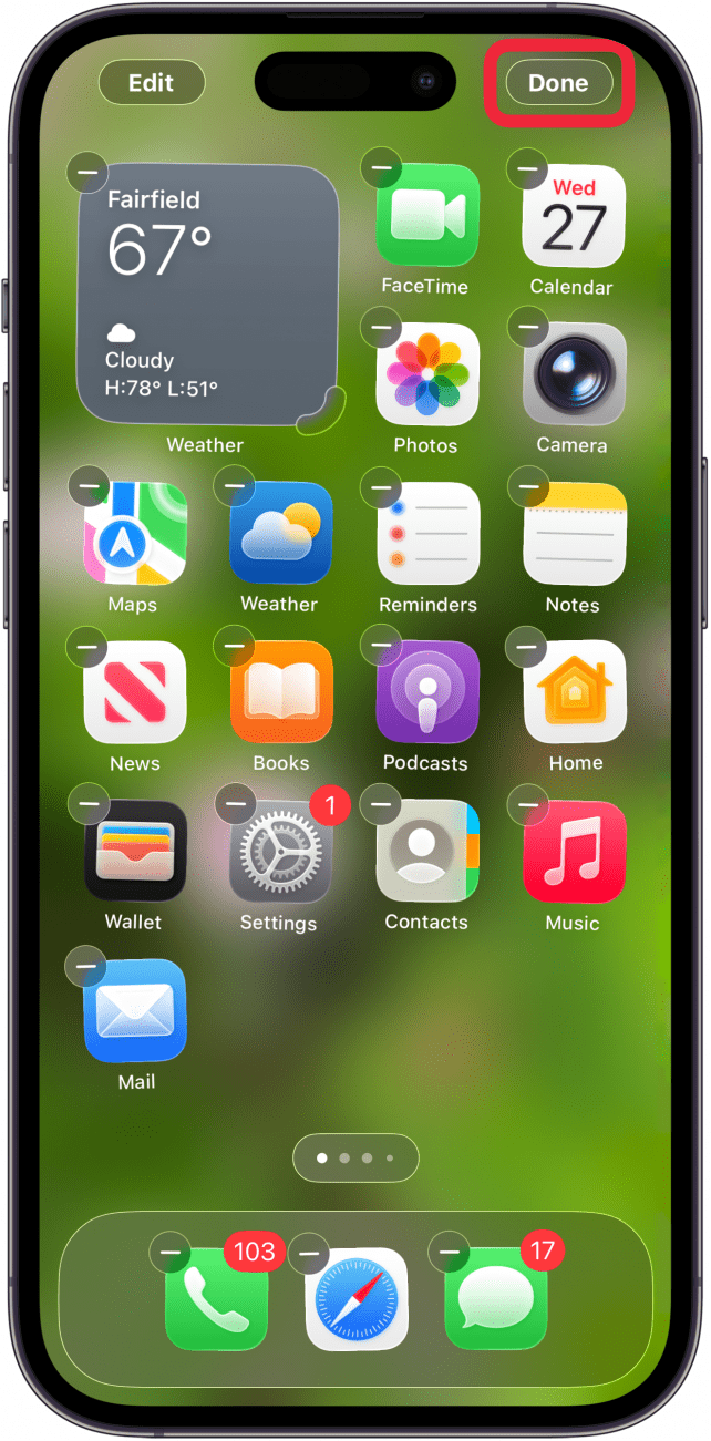- 触摸并按住背景,直到图标抖动。这表明您处于主屏幕编辑模式。