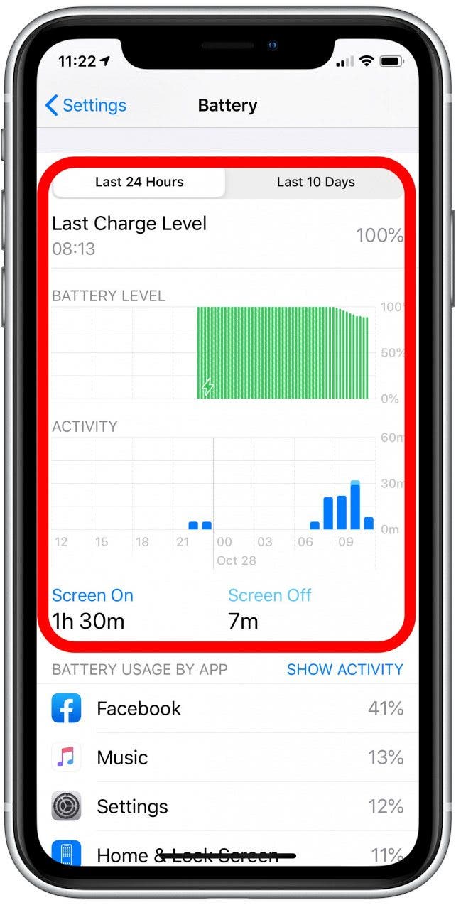 - 在“电池运行状况”下方,您将看到 iPhone 电池电量和活动的图表。