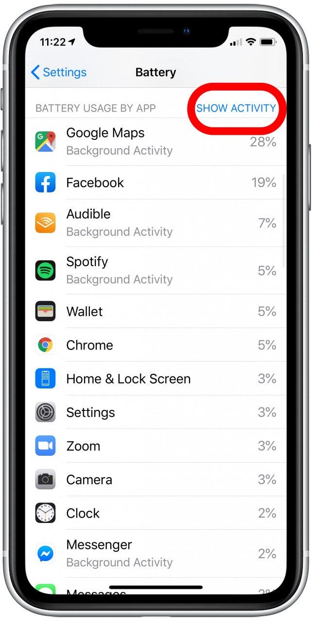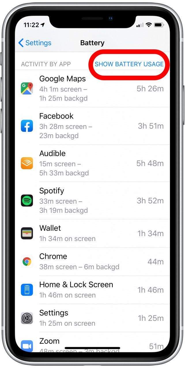 - 向下滚动,您将看到每个应用程序消耗了多少总电池电量。