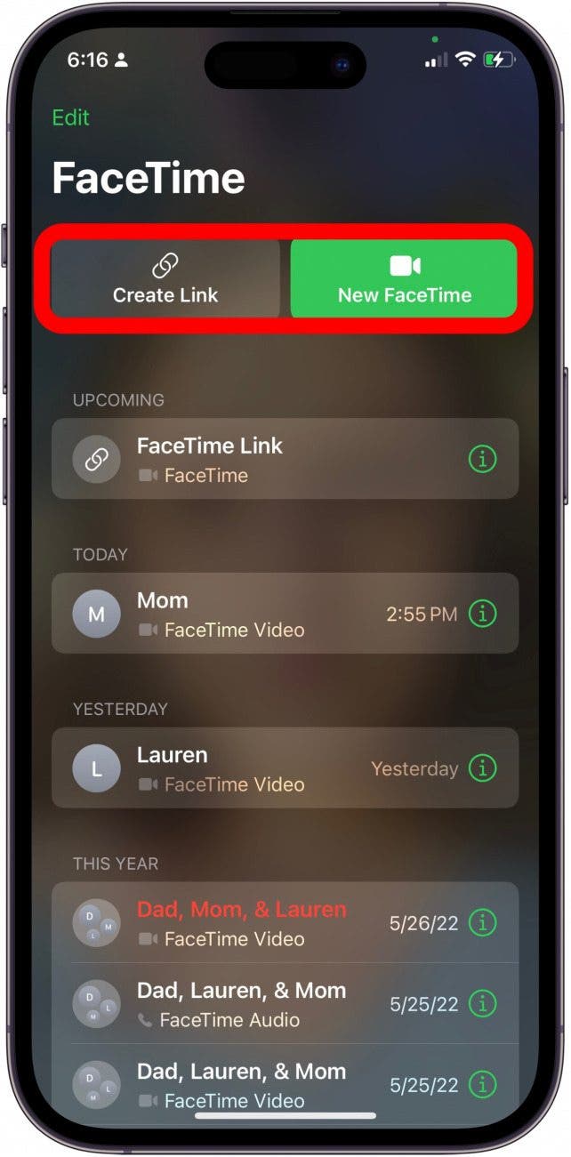 - 从之前的通话列表中选择,选择创建链接安排与 Android 用户的会议或 FaceTime,或点击新的 FaceTime并开始新的视频通话。