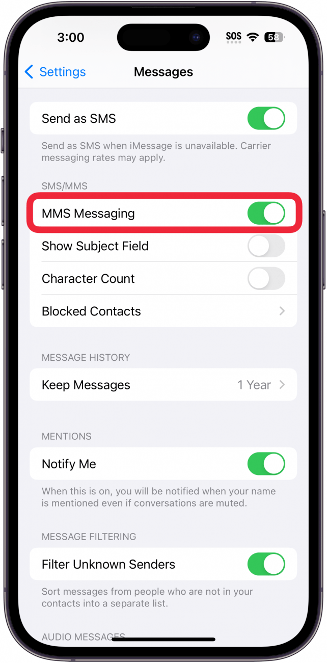 如果您的 iPhone 上禁用了彩信设置,您将无法与 Android 用户接收照片或视频,或者当 iMessage 不可用时。这是 iMessage 中图像无法加载的最常见原因之一。要检查这一点: