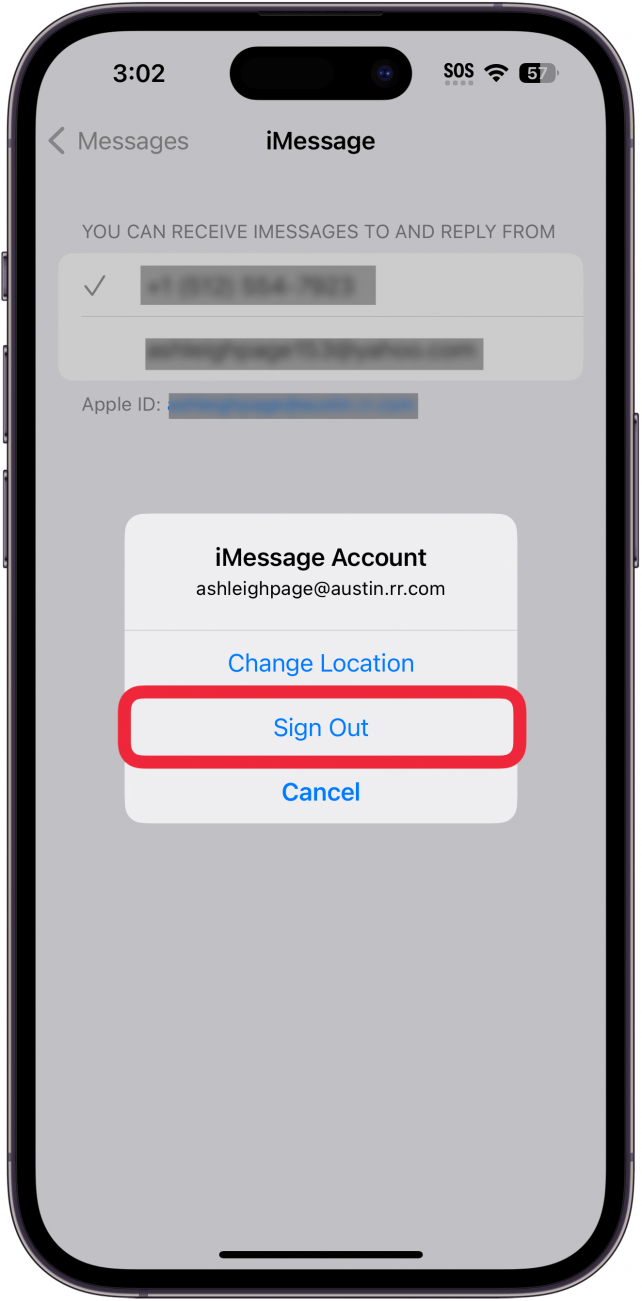 如果“信息”中的图像未下载,下一步应该是退出 iMessage 并使用您的 Apple ID 重新登录。重新加载 iMessage 会清除缓存并帮助图片加载到“消息”应用程序中。