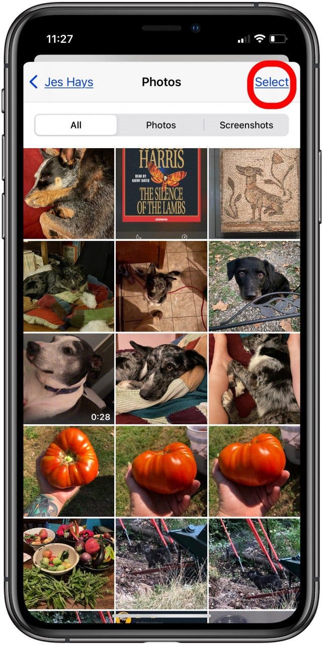 - 点击库选项卡照片应用底部的 ,然后点按您要分享的照片或视频。