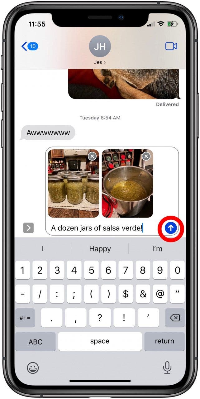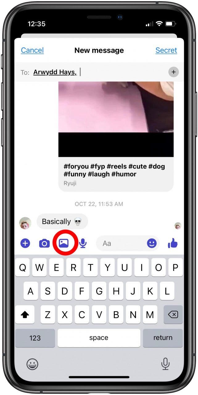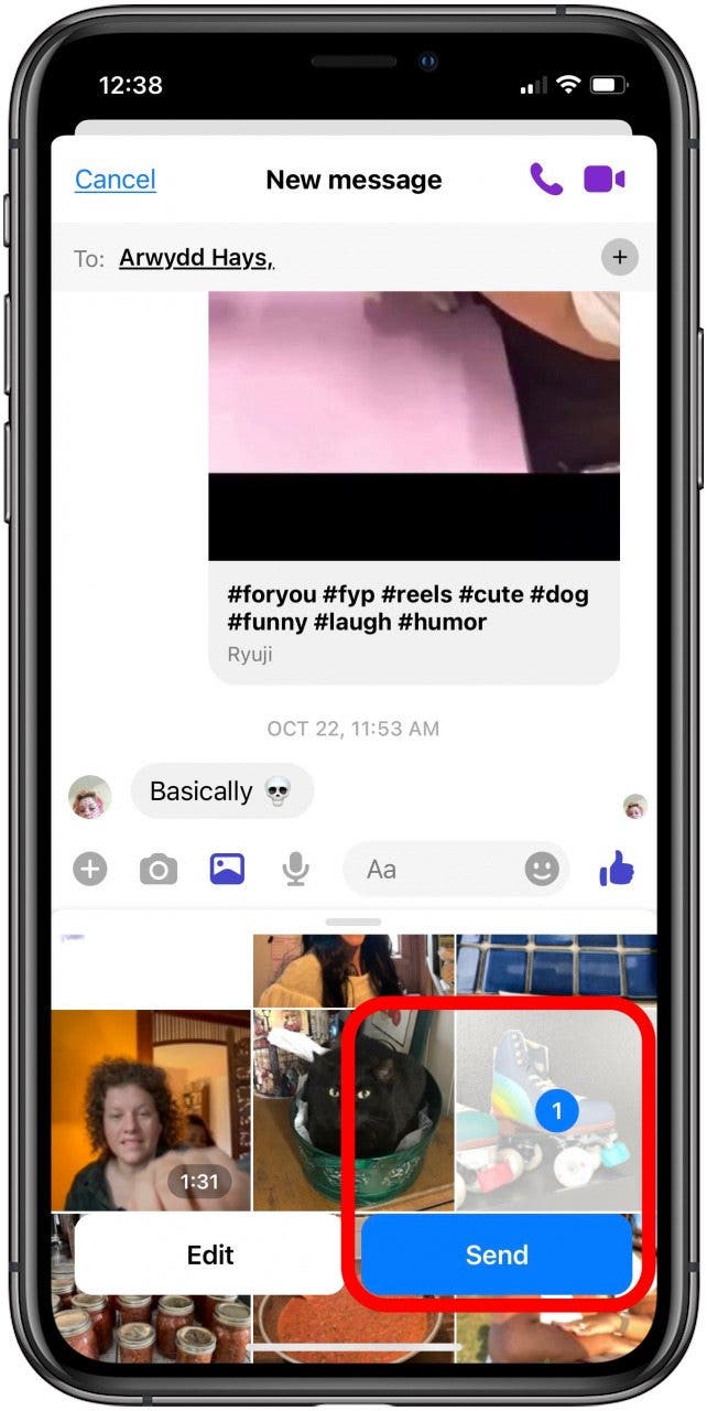 - 照片或视频将出现在文本字段中;如果您愿意,可以随意添加文本,然后点击发送图标。