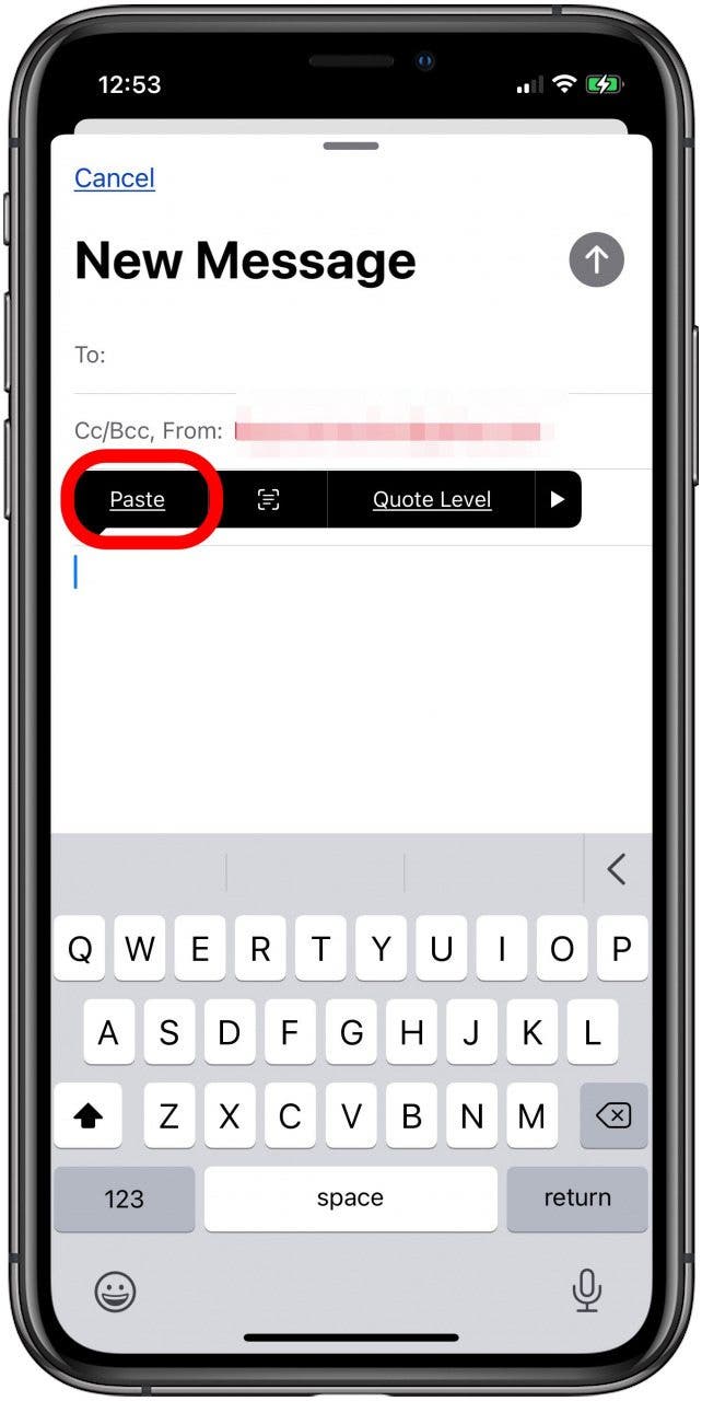 - 要粘贴复制的照片,请开始写一封新电子邮件。点击并按住电子邮件正文并选择粘贴。