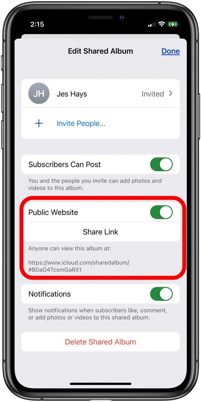 - 现在您可以点击分享链接与您的联系人共享相册,并且可以通过共享链接下面的链接供公众查看。