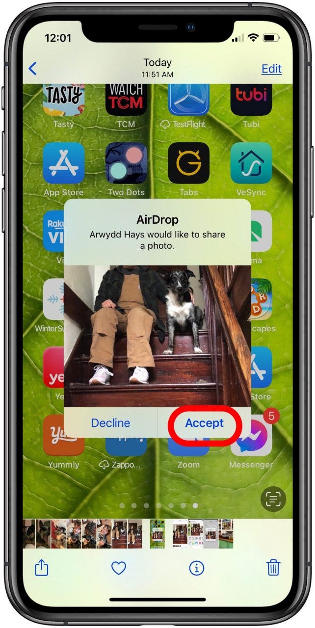 - 您会在 iPhone 上看到一条通知,表明有人通过 AirDropped 向您发送了一张照片;轻敲接受。