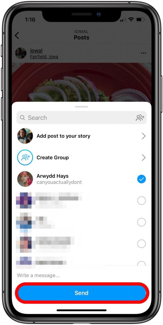 - 将出现潜在收件人列表;还有搜索联系人的选项。选择一个人并点击发送;将发送您帖子的链接。