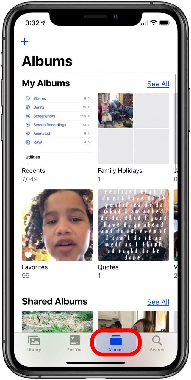 - 打开照片应用程序并点击相册选项卡在页面底部。